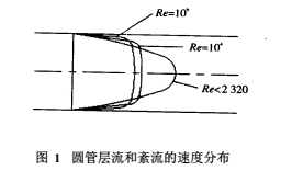 不同流動狀態的水泥漿液流經流量計測量管時,管內圓截面上會呈現不同的流速分布(見圖1),即: 層流的流速變化是拋物線分布,在管中心軸上流速*大,且雷諾數變化、流速分布形態不變;紊流時,流速分布在測量管內壁的近旁比層流流速大,在中心部比層流時流速小,且流速分布形態隨雷諾數的變化而變化。