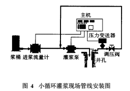 小循環灌漿法的實質是: a泵的吸入量主要由返漿量提供,返漿量的大小由高壓調節閥控制,鉆孔灌漿注入量=流量計量(見圖4);b流量計大部分時間工作在1/3量程之下,相當長的時間內工作在1L/min左右;c返漿漿液不返回攪漿桶,水泥漿液只能在閉合的管道中循環,漿桶內調節水灰比對灌漿漿液的密度影響甚微。