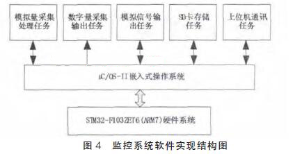 分析本系統軟件設計需求:在對浮子流量計組運行狀態過程中,通過模擬量的采集和分析對系統進行監控,如果發現某一數據值超過預設值后必須立即處理,與此同時需將信息傳輸至上位機。可見系統對軟件的實時性要求較高, 而且在很短的時間內需要處理的任務較多,普通的前后臺程序難以滿足設計的要求。因此系統軟件選擇帶有操作系統的嵌入式平臺進行開發和設計。本設計采用基于STM32 的μC/OS-II 對監測系統的任務進行調度。