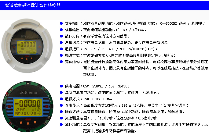 儀表顯示:高清晰度背光LCD顯示(126 x 48 點陣),可同時顯示瞬時、累積流量等信息與相關單位,中文/英文菜單支持