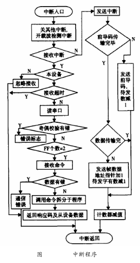在HART通信中,地下污水流量計(jì)作為從設(shè)備進(jìn)行通訊,所以這里的軟件設(shè)計(jì)只是針對(duì)于從設(shè)備。HART通信采用水平和垂直校驗(yàn)的方法。當(dāng)檢測(cè)到接收數(shù)據(jù)有差錯(cuò)時(shí),則等到主設(shè)備命令幀發(fā)完后,通知主設(shè)備數(shù)據(jù)接收有誤。主設(shè)備則重新發(fā)命令幀,從而保證通信的準(zhǔn)確可靠。HART中斷子程序流程圖如圖6所示。由于HART通信為主從方式,HART幀中每個(gè)字節(jié)在物理層傳輸需要9ms左右,為了保證通訊的實(shí)時(shí)性,通訊程序采用串行口終端接收/發(fā)送。該中斷所要完成通信中的主要任務(wù),即接收和發(fā)送幀,幀的拆分和打包。