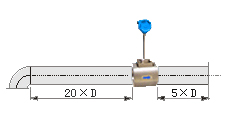 若傳感器安裝點的上游有90°彎并沒有或T形接頭,傳感器上游應有不小于20D的等徑直管段,下游應有不小于5D的等徑直管段。