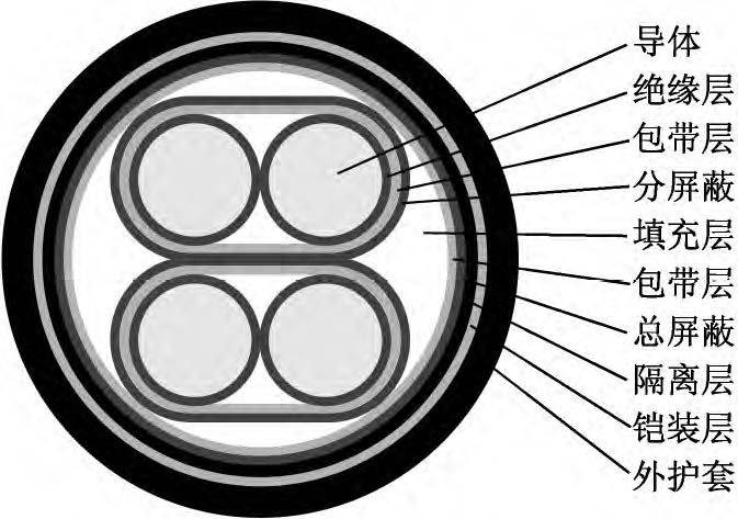 該新型電纜的結構如圖1所示。導體為單股退火鍍錫軟銅線,以提高導體的導電性和防腐蝕性。在導體外繞包一層?。疲矗ň鬯姆蚁┌雽щ妿В欣诮档蛯w和絕緣之間的摩擦起電噪音。絕緣采用材料較為純凈、介電常數較小、具有一定彈性的聚丙烯絕緣級材料,并采用擠壓式擠出,減小絕緣層與導體的間隙。采用對絞組作為信號傳輸線,由于在兩根傳輸線上感應的電壓接近相等,減小了電壓差值,提高了信號傳輸穩定性;對絞組由兩種不同顏色絕緣線芯組成,相鄰線對對絞節距應不大于100mm。對絞分屏蔽組(即對對絞組進行分屏蔽,每對對絞組外繞包兩層聚酯帶和一層厚0.04mm鋁塑復合帶繞包,內置一根7×0.26mm鍍錫銅絞線作引流線)有利于對不同對絞組之間信號串音的抑制和隔離。對絞分屏蔽組同心式絞合成纜,在對絞分屏蔽組間填充非吸濕性材料,以保證纜芯圓整。在成纜纜芯外繞包兩層聚酯帶,再采用鋁塑復合帶繞包,內置鍍錫銅線作引流線,以提高電纜電磁屏蔽能力??偲帘螌油鈹D包隔離層(隔離護套),隔離層采用絕緣級低密度聚乙烯材料。隔離層外采用鎧裝層,鎧裝材料為高導磁合金鋼帶,其為強磁材料,可將外來的磁通大部分限制在鎧裝層的外表面上(僅有少部分能進入被屏蔽的空間);鎧裝時對高導磁合金鋼帶采用縱包焊接,確保其形成一連續圓柱管;鎧裝層可提高電纜抗電磁干擾水平以及對電纜進行加強,減少電纜振動引起的電動勢。外護套采用藍色軟PVC(聚氯乙烯)護層級電纜材料擠包,實現電纜防護。