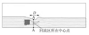 來自上游的水體經浮體結構的阻擋作用,水流繞流經浮體結構的上部和下部區域通過,并在浮體結構背水面的下游區域形成小范圍回流區,此處水流紊亂,流速分布不均勻。試驗過程中,對回流區沿水流方向的長度D(水槽縱向中心斷面處,自浮體結構背水面到沿水流方向流速為0的*遠位置點)進行量測。選取浮體結構下游區域回流區中心點所在斷面進行流速測量對比。流速測量斷面位置A-A見圖3。