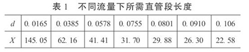 3.直管段長度和生物柴油流量計精度的初步預測在工程設計中,根據流體性質、流量和雷諾數確定α和d值。這樣,按照式(5)就可以依不同的流量計精度要求,對直管段長度進行初步預測,或確定直管段長度后,對流量計的精度做初步預測。當δ= 0.2%時,不同流量下所需直管段長度見表1。