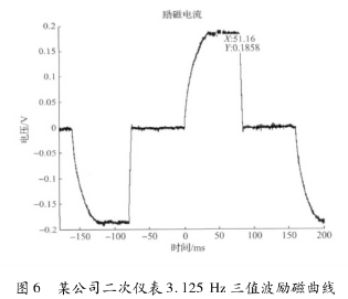 *先,采用某公司生產(chǎn)的二次儀表匹配一次儀表進(jìn)行勵磁。該二次儀表采用在H橋低端設(shè)置恒流晶體管進(jìn)行恒流控制的方法,其勵磁曲線結(jié)果如圖6所示,勵磁頻率為3.125Hz,勵磁方式為三值波勵磁,勵磁電流大約在51.16ms左右進(jìn)入穩(wěn)態(tài),勵磁電流穩(wěn)態(tài)段波動較大。