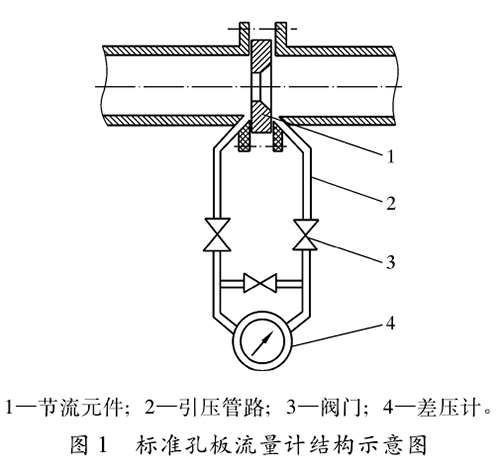標準管道煙氣流量計結構如圖1所示,包括節流元件(標準孔板及其取壓裝置)、傳輸壓差信號的引壓管路、閥門以及差壓計等部分。標準孔板是壓差測量時的一次元件,人們利用它在管道內使流體產生壓差,再通過引壓管路把孔板前、后產生的壓差傳送給差壓變送器,再輸人到二次儀表,從而顯示出管道內流體的靜壓、壓差、瞬時流量和累計流量等計量參數。