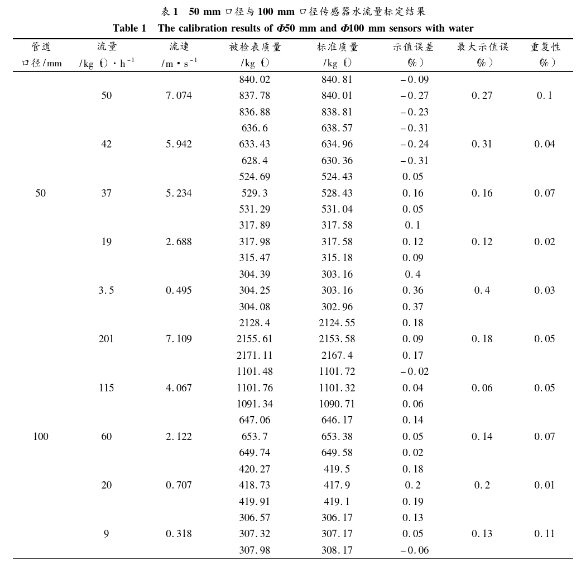 為了評(píng)測系統(tǒng)的實(shí)際應(yīng)用效果,進(jìn)行了水流量標(biāo)定實(shí)驗(yàn)。分別針對(duì)50mm口徑與100mm口徑的傳感器進(jìn)行標(biāo)定。系統(tǒng)勵(lì)磁方式采用方波勵(lì)磁,勵(lì)磁頻率為12.5Hz,管道*大流速為7m/s左右,*小流速為0.3 m/s左右,標(biāo)定結(jié)果如表1所示。