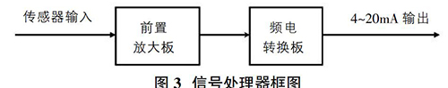 信號(hào)處理器對(duì)渦街流量傳感器產(chǎn)生的頻率信號(hào)經(jīng)過濾波、放大、頻電轉(zhuǎn)換等幾個(gè)環(huán)節(jié)處理,*終將頻率信號(hào)轉(zhuǎn)換為標(biāo)準(zhǔn)4~20mA信號(hào)輸出。信號(hào)處理器框圖如圖3所示。