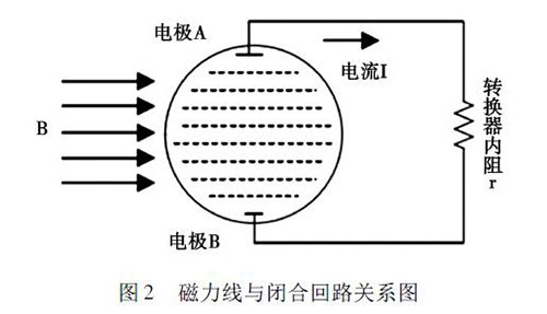 2. 1 正交干擾衛(wèi)生型卡箍電磁流量計(jì)的磁路系統(tǒng)包含有兩個(gè)勵(lì)磁線圈,而導(dǎo)管內(nèi)的液體與傳感器電極及轉(zhuǎn)換器結(jié)構(gòu)組成了一個(gè)閉合的回路,如圖2 所示。理論情況下,磁力線( 圖中B) 應(yīng)與閉合回路相平行,但是由于裝配過(guò)程中的誤差,導(dǎo)致磁力線不可能完全平行于這一閉合回路,出現(xiàn)部分磁力線成一定角度穿過(guò)回路的現(xiàn)象,這引起了即使沒(méi)有液體流動(dòng)的情況下,傳感器的電極上也會(huì)產(chǎn)生感應(yīng)電動(dòng)勢(shì),就形成了正交干擾的基本形式。