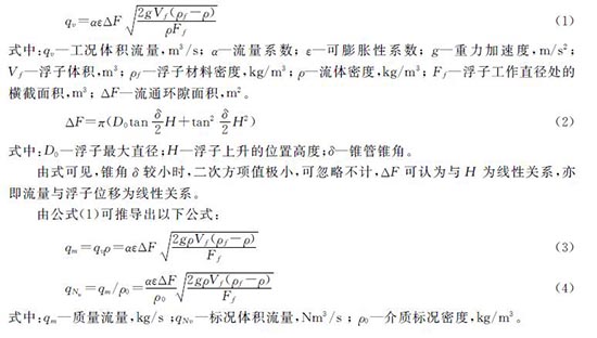 流量計垂直安裝在管道上,流體自下向上流經(jīng)錐管,浮子在P1、P2差壓作用下產(chǎn)生上升或下移,當浮子此差壓(P2-P1)與浮子重力G、浮力F、粘滯力合力平衡時,處于平衡狀態(tài)。建立方程并推導(dǎo)(可參考相關(guān)專業(yè)資料,此處省略),忽略粘滯力影響,假設(shè)流量系數(shù)為常數(shù),可得出浮子位移與流量成線性對應(yīng)關(guān)系。浮子流量計的流量方程為: