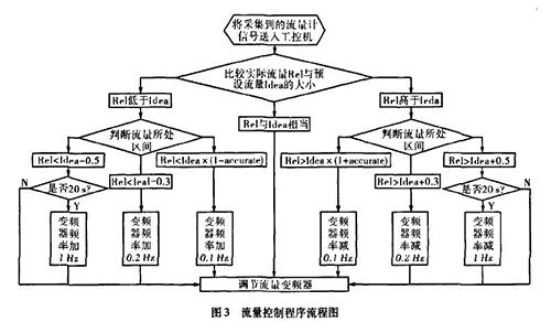 實際生產中流量一直在某個區域內波動,且其動態特性不易掌握。從上面的理論中我們能夠讓誤差△£盡可能的小,這樣距我們所需要的理論值%就越接近。而減小誤差需要我們把n取的盡可能大,也就是在生產時間內劃分更多的周期去調節流量。當工控機根據測濃硫酸流量計傳送回來的信號發出調節變頻器工作頻率的指令后,電機調整功率到測濃硫酸流量計的實際測量為一個工作周期,我們知道從指令發送到實際測量值返回有一個較大的滯后,如果調節的周期時間小于流量計本身的一個工作周期,那么顯然不可能達到減小誤差的目的。利用模糊控制思想H。,在控制程序中我們把流量的波動區域劃分為±缸×Yo,Yo-t-O.3,Yo±0.5四個區域,其中缸為可調節的誤差范圍,生產中我們取0.015,流量區域劃分的單位均為t/h。針對不同的區域采取不同的調整方案。具體流程如圖3所示。圖中變量Rel表示實際測量的流量,變量Idea表示理論流量。
