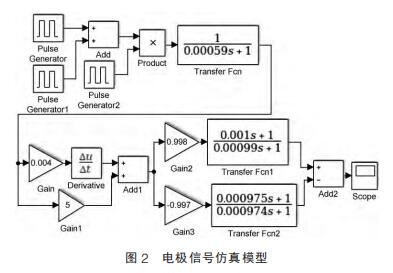 本文基于 Matlab 中 Siumlink 對(duì)電極信號(hào)進(jìn)行仿真,勵(lì)磁方式為三值波勵(lì)磁,勵(lì)磁頻率 f=25Hz,傳感器參數(shù) D=40mm、Rx=88.8Ω、Lx=162mH,勵(lì)磁系統(tǒng)參數(shù) Ue=100V、穩(wěn)態(tài)電流 I0=200mA。基于電極測(cè)量回路搭建的仿真模型如圖 2 所示,圖中信號(hào)模塊 pulsGenerator 通過(guò)加法器、乘法器得到勵(lì)磁電流。由公式(1),在固定流速下感應(yīng)電勢(shì)與勵(lì)磁電流成正比,通過(guò)增加 Gain1 模塊得到感應(yīng)電勢(shì)信號(hào)。 對(duì)勵(lì)磁電流進(jìn)行求導(dǎo)即經(jīng)模塊 Derivative 得到微分噪聲, 其中 Gain 值與 Lx 和 L1 相關(guān)。 感應(yīng)電勢(shì)與噪聲經(jīng)Add1 疊加之后得到電極信號(hào) E1(t)。 scope 觀察輸出信號(hào)波形。仿真波形和真實(shí)波形如圖 3 所示。 將傳感器參數(shù)代入到勵(lì)磁電流穩(wěn)態(tài)調(diào)節(jié)時(shí)間公式中,得電流上升時(shí)間為 360μs,測(cè)得實(shí)際上升時(shí)間為 390μs,兩者相差不大,驗(yàn)證了仿真模型的正確性。