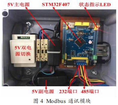 Modbus 通訊模塊如圖 4 所示。為保證供電穩定,使用了電源切換裝置給主板供電,共有主副兩路 5V 電源。