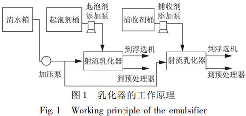 選煤廠浮選藥劑乳化裝置是將藥劑和水制成乳化液,實現藥劑的合理使用,將對浮選效果和節約藥劑起到一定的作用。在使用中可根據藥劑和水的配制比例觀察藥劑的乳化效果,通過乳化器操作箱內的的電位器調整水泵轉速,即調整乳化壓力。自動加藥控制是根據入浮流量與入浮濃度的檢測結果,控制起泡劑與捕收劑的加入。乳化器的工作原理如圖 1 所示。