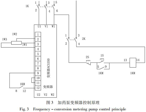 STD - Ⅲ型浮選工藝參數自動測控系統通過雙膜盒差壓計測量原礦漿濃度; 采用插入式電磁流量計測量原礦漿流量,由 PLC 計算出入浮干煤泥量和藥劑的瞬時添加量,用變頻式計量泵完成浮選藥劑的添加。通過上位機還可以打印小時、班、天及月的運行數據,更加有利于生產管理及技術分析,藥劑自動原理如圖 2 所示,k1、k2、k3 是計算修正參數。以 PID 算法為核心,通過優化控制程序計算出藥劑給定量,在捕收劑和起泡劑管道上分別安裝藥劑測量裝置,用于檢測藥劑的添加量。當藥劑測量值小于藥劑給定量時,PID 輸出增大,反之則減小。加藥泵變頻器控制原理如圖 3 所示。