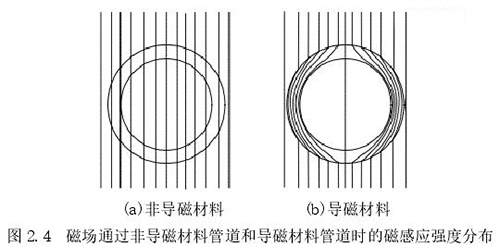 1.測量管:主要是傳感器的管道,該管道由高導電率非導磁材料制成,可保證流體在通過時能夠表現出自身的電磁效應,在該管道內中安裝了內襯。使用非導磁材料的原因是保證勵磁線圈中所產生的磁場不會順著管道流走,確保測量管道內部產生明顯的磁感應線,下圖 2.4 中展示了利用非導磁材料和導磁材料管道中所產生磁感應線的情況。