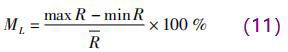 *先分析一定 D × H 條件下,L 變化時傳感器內的權函數分布情況。由于傳感器異徑管部分高度 H 越小信號越強,但壓損也越大,因此,H 設置為 30 ~ 50 mm; 異徑管寬度 D 越大壓損越小,但寬度越大傳感器體積也越大,所以, D 設置為 60 ~ 90 mm; 異徑管段上下需要放置激勵線圈,同時異徑段前后需要有一定長度的過渡段來穩定流型,因此, L 設置為 60 ~ 120 mm。一共分析了 6 組 D × H 尺寸的傳感器權函數分布隨 L 的變化情況,如表 2 所示。由于電極截面內的權函數分布對感應電動勢影響*大,因 此,利 用式( 10) 計算電極截面 xy 平面內的權函數整體均勻度 R。定義相同 D × H 條件下,權函數均勻度隨 L 變化的波動率為 ML,如下