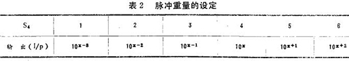 脈沖重量設(shè)定用S4插頭選擇進(jìn)行,它的設(shè)定有一定的條件,這些條件是脈沖輸出的類型、脈沖寬度和刻定常數(shù)。并且它的選擇范圍還要依據(jù)脈沖寬度和*大測(cè)量流量-口-口口-l0的X方(m3/h)來(lái)確定。其系數(shù)-(數(shù)字同*大流量m3/h)由*大流量的前三位有效數(shù)定決定,而對(duì)應(yīng)于“x”值的脈沖重量(l/p)見(jiàn)表2。