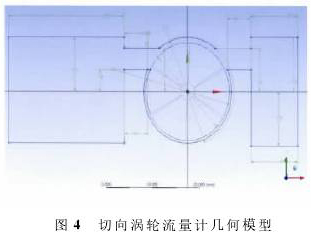 高溫導熱油流量計仿真模型見圖4。圖4中右側入口和左側出口均寬20mm,在計算中分別設置為速度入口和速度出口,轉動部分直徑(圖4中D1)為18mm,葉片頂端半徑為8.5mm,轉動腔上半部分直徑(D3)為20mm,轉動腔下半部分直徑(D2)為19mm,轉動腔入口出口寬度均為4mm。