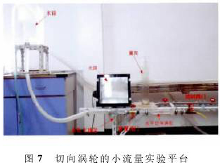 為了驗證仿真的準確性,通過室內實驗對其驗證。切向渦輪采用可視化研究平臺,整個渦輪的結構都采用亞克力板雕刻組裝而成。如圖7所示,水箱主要提供穩定水壓,水平切向渦輪做成開口系統并放置在實驗支撐架上,前置閥門可控制水流,在需要更換切向渦輪的零件時可關閉,控制閥門主要是控制流經切向渦輪的流量,流量測量仍采用傳統可靠的容積時間法。實驗時以染色劑作為示蹤劑,以觀察流場的分布情況。