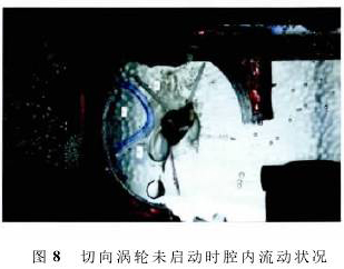 如圖8所示,記錄的是未啟動時切向渦輪內的流場,水從圖8左側流入渦輪,從右側流出,實驗時水的流速很低(0.05m3/d),腔體1中的流動可近似看作不可壓縮無旋繞角流動,此時流體在腔體1中的速度可看成對稱分布,由伯努利方程算得的壓強也是對稱分布,此時2個壁面幾乎沒有壓強差,所以渦輪未啟動。