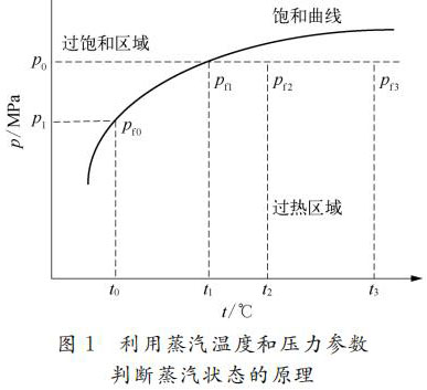 利用蒸汽的溫度壓力參數自動判斷蒸汽處于過熱狀態還是飽和狀態,原理如圖1所示。關鍵是判斷蒸汽的溫度壓力值是落在臨界飽和曲線的下方還是上方,如果落在下方,則為過熱狀態;如果落在上方,則為飽和狀態。