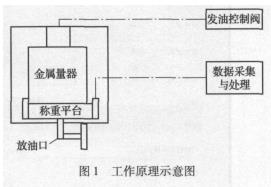 本裝置采用容積法和稱重法相結合的工作原理。對于質量流量計,采用稱量法直接比較,確定流量計的誤差。上裝放油閥防溢出控制系統,采用液位動態監視,一旦超過容器安全液位高度,即可切斷發油動力。在運輸防震或非測量狀態時,對秤進行與稱重容器的脫離操作,保證稱重的可靠性。在稱重狀態時,需要對枰進行調平和清零,此部分采用動態水平的方式進行,即以水平位一致的方法調整稱重平臺。工作原理如圖1所示。