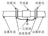 由于污水處理流量計(jì)的測(cè)量感應(yīng)電壓很小,電壓較低,易受外界電磁噪聲的影響,故在安裝時(shí)應(yīng)進(jìn)行可靠的接地連(跨)接。金屬管道污水處理流量計(jì)接地連(跨)接方法如圖3所示。