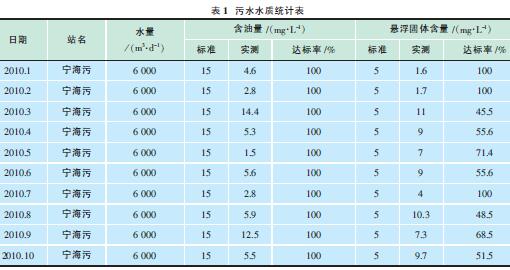 以一礦為例,2010年1~10月寧海污水站累計(jì)處理污水187萬(wàn)m3,日均6200m3,1~10月份外輸污水含油累計(jì)達(dá)標(biāo)率100%,外輸懸浮物累計(jì)達(dá)標(biāo)率69.7%(見表1)。